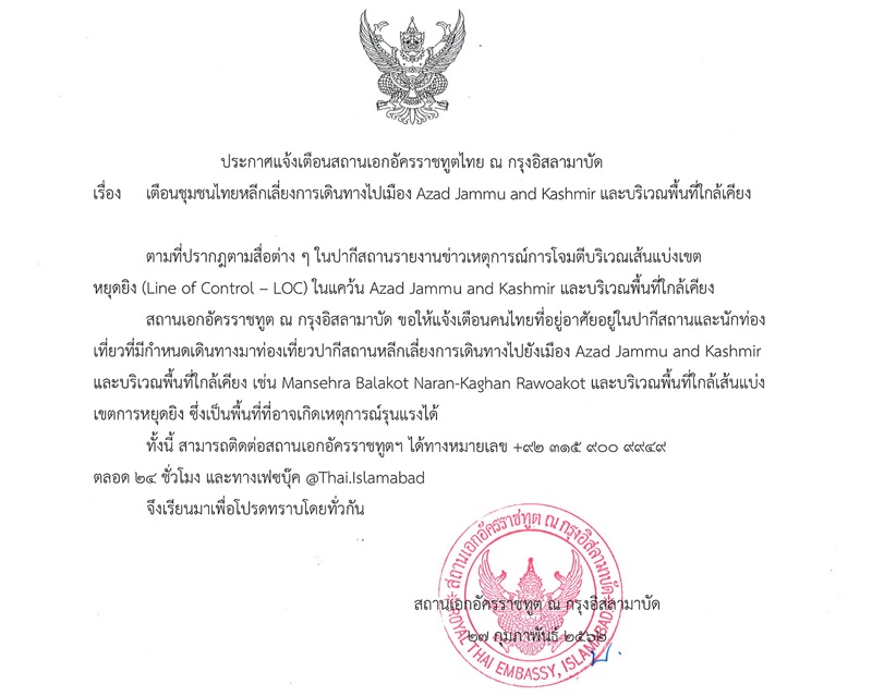 สถานเอกอัครราชทูตไทย ณ กรุงอิสลามาบัด เตือนคนไทยเลี่ยงเดินทางไปเมือง Azad Jammu and Kashmir หลังปากีสถาน สั่งยิงเครื่องบินอินเดีย ประกาศปิดน่านฟ้า