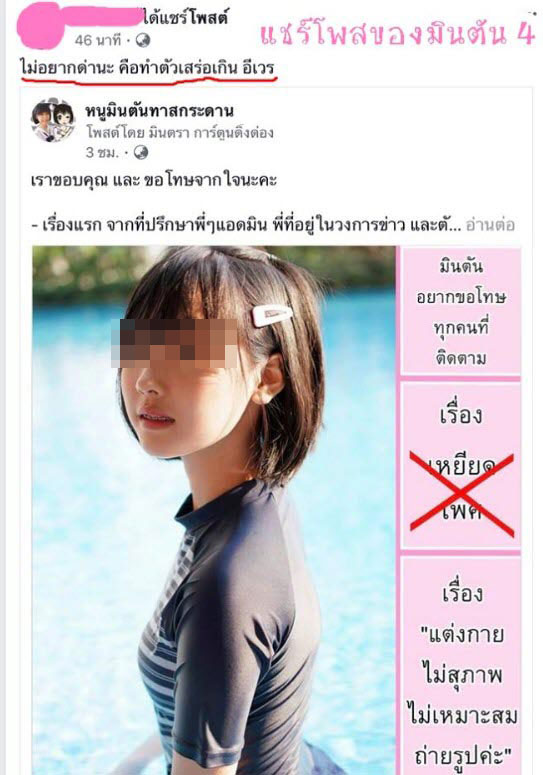 หนูมินตันทาสกระดาน เน็ตไอดอลวัยใส ขอโทษกรณีถ่ายภาพเป้าตุง รับไม่เหมาะสมจริง ชวนเพศที่ 3 บางส่วน แก้พฤติกรรมที่ไม่เหมาะสมทั้งคำพูดหยาบ แต่งตัวโป๊