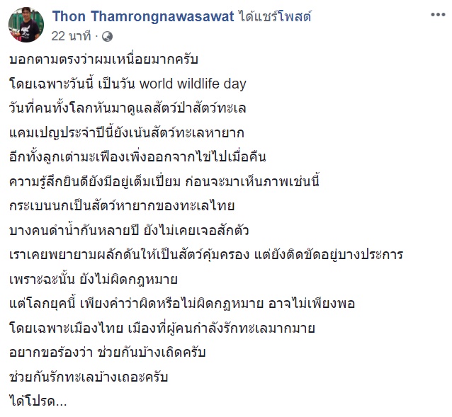 โดย ดร.ธรณ์ ระบุข้อความว่า "บอกตามตรงว่าผมเหนื่อยมากครับ โดยเฉพาะวันนี้ เป็นวัน world wildlife day วันที่คนทั้งโลกหันมาดูแลสัตว์ป่าสัตว์ทะเล แคมเปญประจำปีนี้ยังเน้นสัตว์ทะเลหายาก อีกทั้งลูกเต่ามะเฟืองเพิ่งออกจากไข่ไปเมื่อคืน ความรู้สึกยินดียังมีอยู่เต็มเปี่ยม ก่อนจะมาเห็นภาพเช่นนี้ กระเบนนกเป็นสัตว์หายากของทะเลไทย บางคนดำน้ำกันหลายปี ยังไม่เคยเจอสักตัว เราเคยพยายามผลักดันให้เป็นสัตว์คุ้มครอง แต่ยังติดขัดอยู่บางประการ เพราะฉะนั้น ยังไม่ผิดกฎหมาย แต่โลกยุคนี้ เพียงคำว่าผิดหรือไม่ผิดกฎหมาย อาจไม่เพียงพอ โดยเฉพาะเมืองไทย เมืองที่ผู้คนกำลังรักทะเลมากมาย อยากขอร้องว่า ช่วยกันบ้างเถิดครับ ช่วยกันรักทะเลบ้างเถอะครับ ได้โปรด..."