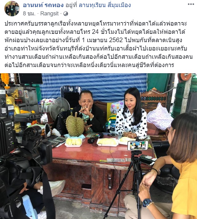 ล่าสุด วันที่ 5 มีนาคม 2562 เสี่ยล้งทุเรียน ได้โพสต์ผ่านทางเฟซบุ๊ก อานนท์ รถทอง ระบุว่า
