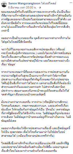 ทั้งนี้ การที่ตนโพสต์สิ่งนี้เพราะรักที่จะเห็นการเปลี่ยนแปลงที่ดี และรักที่รัฐและประชาชนได้ร่วมมือกันสร้างเมืองให้ดีขึ้น แต่อย่าพูดแต่เรื่องดี ๆ โดยไม่ลงมาทำงานด้วยกันจริงเลย
