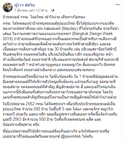 จากกรณีเพจ ผู้ว่าฯ อัศวิน ได้โพสต์เกี่ยวกับกรณีที่ทาง กทม. ได้ทดลองนำป้ายหยุดรถเมล์รูปแบบใหม่ ซึ่งได้รูปแบบจากแนวคิดของภาคประชาสังคม เช่น กลุ่มเมล์เดย์ (Mayday) ที่ได้ช่วยกันคิดและนำเสนอในงานเทศกาลงานออกแบบกรุงเทพฯ (Bangkok Design Week 2018) เพื่อติดตั้งตามเส้นทางรถไฟฟ้าสายสีเขียว และจุดเชื่อมต่อการเดินทางสำคัญ ๆ ในกรุงเทพฯ พร้อมระบุว่าในปีงบประมาณ 2562 จะจัดสรรงบประมาณ เพื่อปรับปรุงป้ายหยุดรถเมล์เป็นรูปแบบใหม่ จำนวน 500 ป้าย และปี 2563 อีกจำนวน 500 ป้าย นั้น