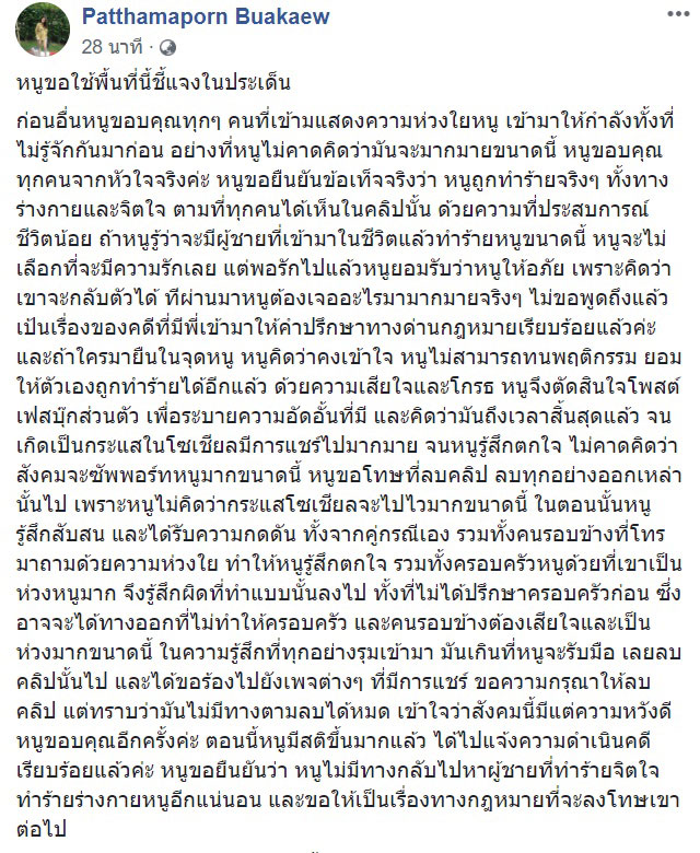 "#กูหมดความอดทน บัดซบที่สุดในชีวิต คนทำผิดเคยเห็นแต่เขาขอโทษที่ไม่รู้จักผิดชอบชั่วดี ใช้แต่กำลังตัดสินปัญหา ครั้งแรกก็แล้วครั้ง 2 ก็แล้ว ครั้งสามก็แล้ว จนถึงครั้งที่ 6 อัปคลิปเราอนาจารลงสตอรี่ คนดี ๆ คนปกติที่ไหนเขาทำกัน พยายามอดทน ครั้งแล้วครั้งเล่า จ่ายค่าพยาบาลให้เราตอนไปหาหมอนึกว่าจะเป็นคนดีละ กลับมาตีซ้ำอีก
