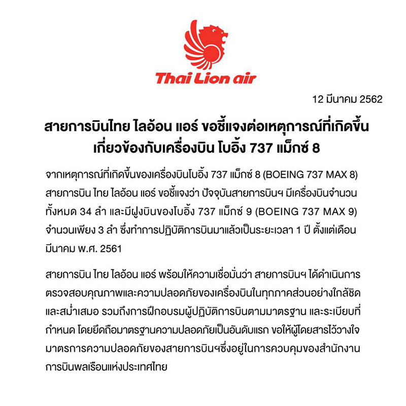 ทั้งนี้ สายการบินไทย ไลอ้อน แอร์ ได้ออกประกาศชี้แจงว่า ทางสายการบินมีเครื่องบินจำนวน 34 ลำ และมีเครื่องบินโบอิ้ง 737 แม็กซ์ 9 เพียง 3 ลำ ซึ่งทำการบินมาเป็นระยะเวลา 1 ปีแล้ว มีการตรวจสอบคุณภาพความปลอดภัยอย่างสม่ำเสมอ รวมถึงฝึกอบรมผู้ปฏิบัติการบินตามมาตรฐานและระเบียบที่กำหนด ขอให้ผู้โดยสารไว้วางใจ