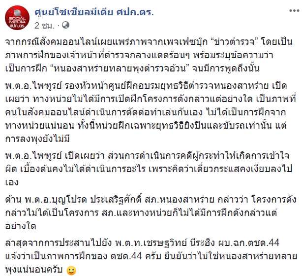 วันที่ 13 มีนาคม 2562 เฟซบุ๊ก ศูนย์โซเชียลมีเดีย ศปก.ตร. ได้ชี้แจงว่า จากกรณีสังคมออนไลน์เผยแพร่ภาพจากเพจเฟซบุ๊ก ?ข่าวตำรวจ? โดยเป็นภาพการฝึกของเจ้าหน้าที่ตำรวจกลางแดดร้อน ๆ พร้อมระบุข้อความว่าเป็นการฝึก ?หนองสาหร่ายทลายพุงตำรวจอ้วน? จนมีการพูดถึงนั้น