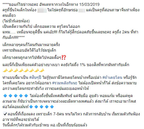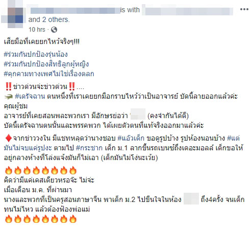 เมื่อวันที่ 15 มีนาคม 2562 ผู้ใช้สมาชิกเฟซบุ๊กรายหนึ่ง มีการโพสต์แฉเรื่องราวของอาจารย์คนหนึ่งข่มขืน ลวนลามเด็กนักเรียนหญิงหลายคนมาเป็นเวลา 10 ปี แถมมีการถ่ายรูปกับคลิปเก็บไว้ด้วย