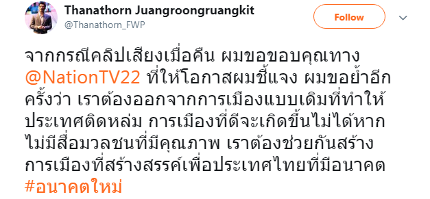 (20 มีนาคม 2562) ผู้สื่อข่าวรายงานว่า นายธนาธร จึงรุ่งเรืองกิจ หัวหน้าพรรคอนาคตใหม่ ได้โพสต์ข้อความผ่านทวิตเตอร์ @Thanathorn