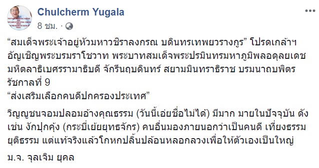 หม่อมเจ้าจุลเจิม ยุคล ทรงโพสต์เฟซบุ๊ก ยกพระบรมราโชวาทส่งเสริมเลือกคนดี วิญญูชนจอมปลอมมีมาก คนอื่นมองภายนอกว่าดี แท้จริงโกหกปลิ้นปล้อนให้ตัวเองเป็นใหญ่