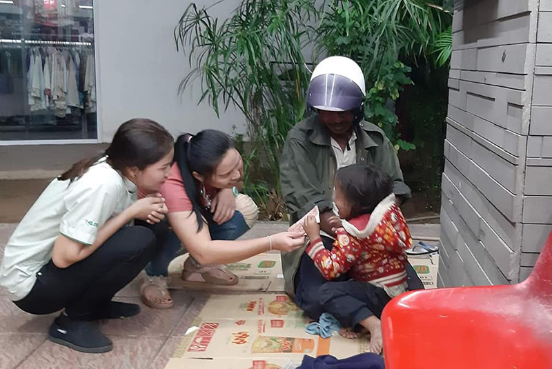 โดยพนักงานสาวเซเว่นได้มีการแสดงออกถึงน้ำใจด้วยการนำกระดาษลังมาจัดเป็นที่นอนให้ พร้อมกับนำข้าวต้มมาให้ทั้งสองได้รับประทาน และพูดคุยไถ่ถามด้วยความเป็นมิตร นอกจากนี้ผู้คนที่ผ่านมาพบเห็น บ้างก็ซื้อขนมมาให้ บ้างก็มอบเงินให้เพื่อเดินทางต่อ นับเป็นการแสดงออกถึงความเอื้อเฟื้อเผื่อแผ่ที่มีต่อเพื่อนมนุษย์ได้อย่างน่าชื่นชมจริง ๆ