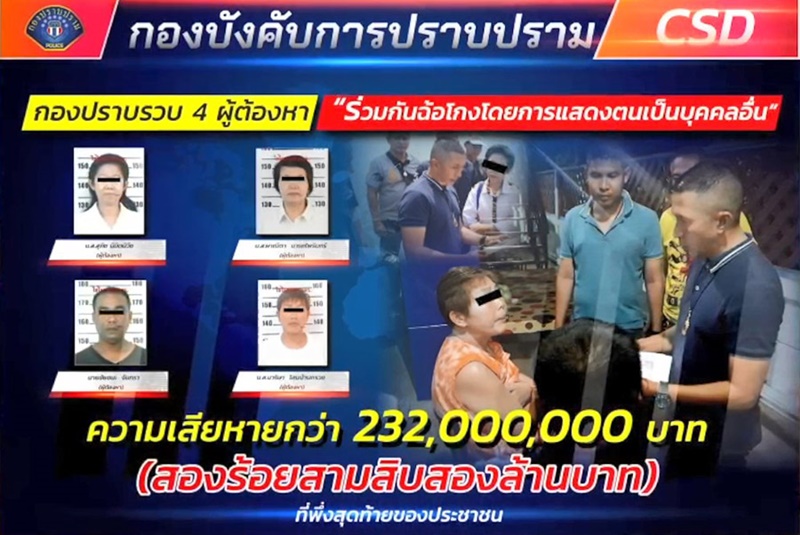 เจ้าหน้าที่ตำรวจแถลงผลการจับกุม น.ส.สุภิช นิมิตนิวัช อายุ 61 ปี, น.ส.ผาณิตา นารถไพรินทร์ อายุ 52 ปี, นายชัยชนะ จันทรา อายุ 45 ปี และ น.ส.มาริษา โสมบ้านกรวย อายุ 42 ปี ฐานร่วมกันฉ้อโกงโดยแสดงตนเป็นคนอื่น