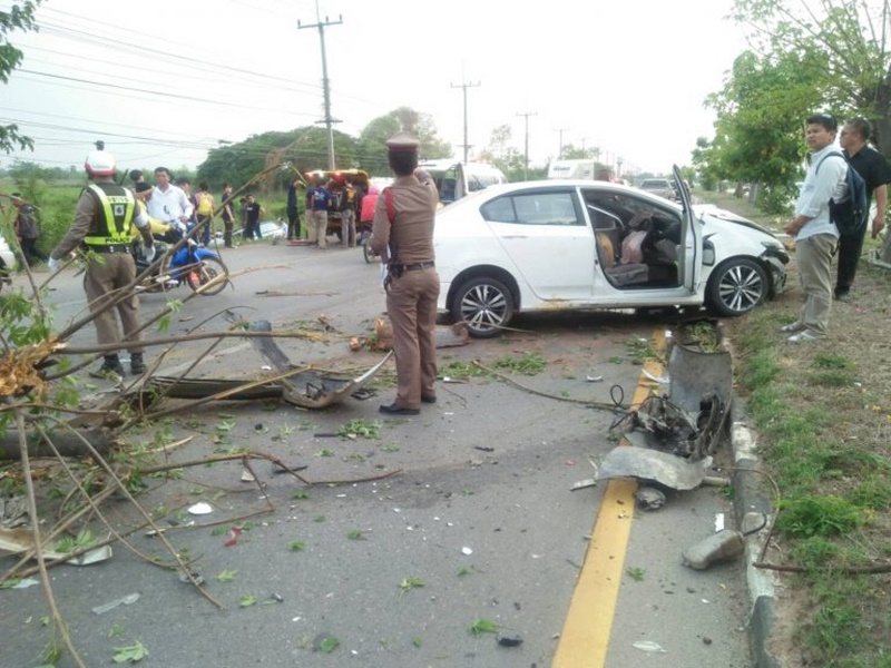 สภาพพุ่งชนต้นไม้เกาะกลางถนนได้รับความเสียหาย