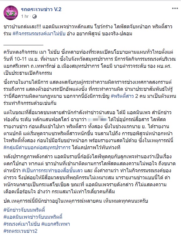 เพจดังแฉ แอดมินเพจข่าวชื่อดัง ไลฟ์จับหน้าอกพริตตี้ 2 คน กลางงานเมาไม่ขับ จ.สมุทรปราการ แถมมีการสอบถามค่าตัว รับงานแบบไหนบ้าง ด้านโซเชียลวิจารณ์ยับ ทั้งหื่นแถมไม่ให้เกียรติผู้หญิง