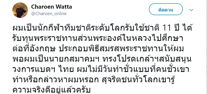 ล่าสุดวันนี้ (19 เมษายน 2562) นายเจริญ วรรธนะสิน พ่อของนักร้องดัง โจ นูโว และ เจ เจตริน ได้ออกมาโพสต์ชี้แจงเรื่องดังกล่าวผ่านทวิตเตอร์ส่วนตัว Charoen Watta ว่า ตนเป็นนักกีฬาทีมชาติระดับโลก รับใช้ชาติมานานกว่า 11 ปี และยังได้รับทุนพระราชทานส่วนพระองค์จากในหลวงให้ไปศึกษาต่อที่อังกฤษ อีกทั้งยังประกอบพิธีสมรสพระราชทานให้ตน รวมถึงยังทรงโปรดเกล้าฯ สนับสนุนวงการแบดมินตันไทยมาโดยตลอด