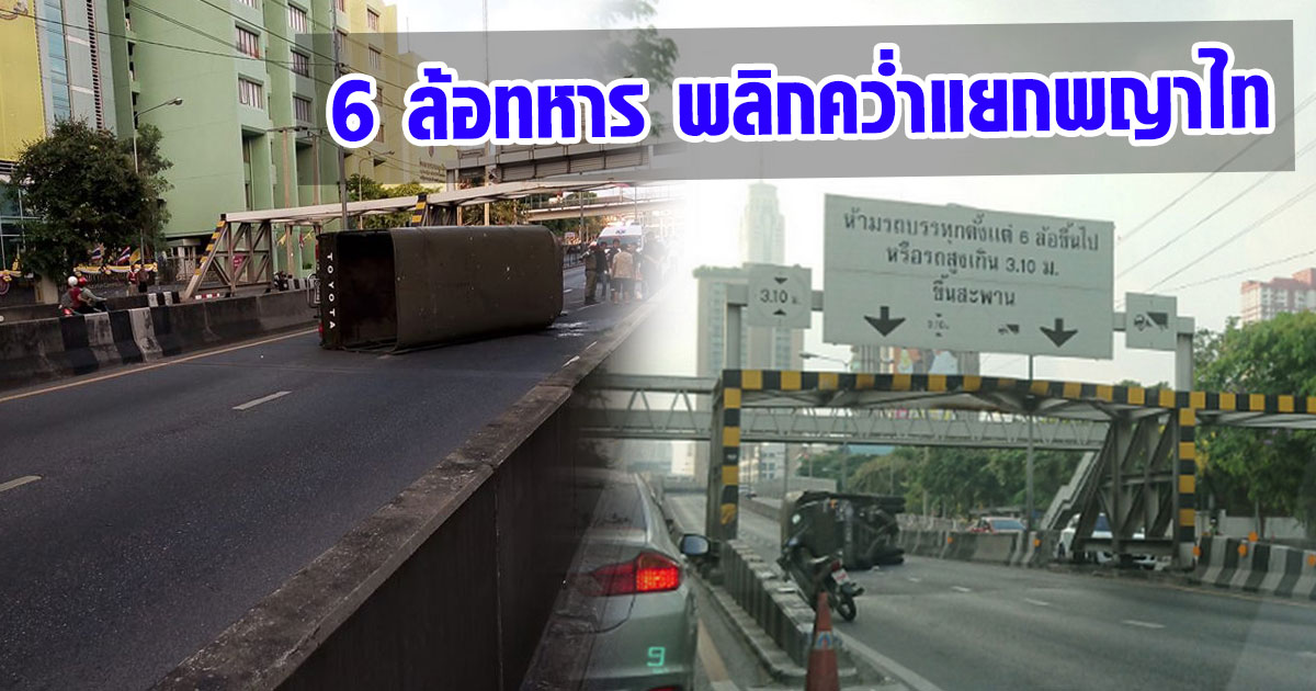 เกิดเหตุ รถ 6 ล้อทหาร พลิกตะแคงขวาง 2 ช่องถนน บริเวณเชิงทางขึ้นสะพานข้ามแยกพญาไท ปิดการจราจรชั่วคราว