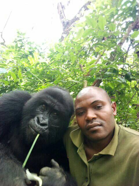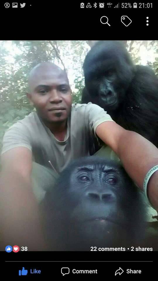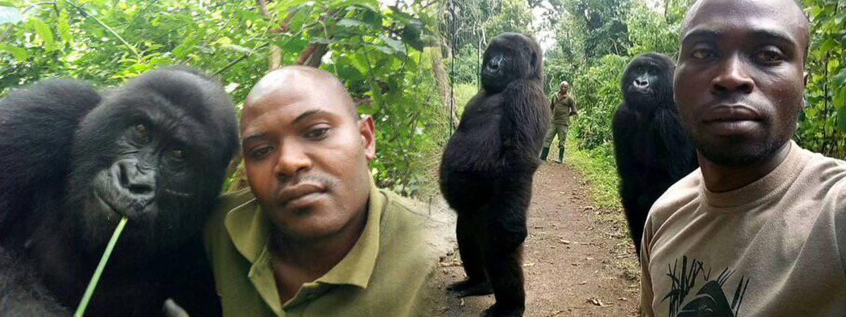 เจ้าหน้าที่ถ่ายเซลฟี่คู่กอริลลา ขณะลาดตระเวนในอุทยานแห่งชาติ โพสท่ามองกล้องเหมือนคนสุด ๆ ทำโลกออนไลน์ฮือฮาหนัก
