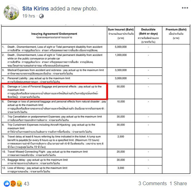 กระทั่งต่อมา ผู้ใช้เฟซบุ๊ก Ong Mitprakrobchoke ได้โพสต์แสดงความคิดเห็นเกี่ยวกับเหตุการณ์ที่เกิดขึ้น ถึงความแตกต่างระหว่างการชิงทรัพย์ กับ การปล้นทรัพย์ ซึ่งถ้าให้อธิบายง่ายที่สุดก็คือ ผู้ก่อเหตุต้องใช้กำลังเอาทรัพย์ไปจากผู้เสียหาย ผู้เสียหายจึงจะสามารถเคลมประกันได้ ซึ่งบริษัทประกันการเดินทางส่วนใหญ่ใช้เงื่อนไขเหมือนกัน ผู้โพสต์จึงแนะนำว่าควรซื้อประกันอย่างอื่นเพิ่มเติมด้วย ในกรณีที่ถูกทุบกระจกเอาของออกไปจากรถ