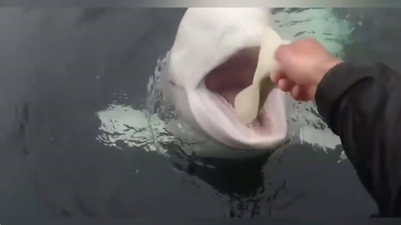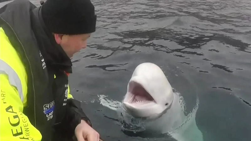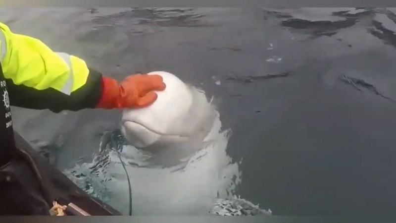 วาฬเบลูก้าสายลับรัสเซีย โผล่นอกชายฝั่งนอร์เวย์ บนตัวติดสายรัดกล้อง GoPro ทักทายชาวประมง แถมขออาหาร ผู้เชี่ยวชาญเชื่อเป็นสมาชิกกองทัพเรือรัสเซีย และได้รับการฝึกฝนมาอย่างดี