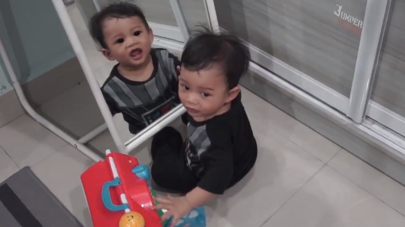เนื่องจากเขากำลังนั่งเล่นอยู่ด้านหน้ากระจก แล้วหันไปทางอื่น