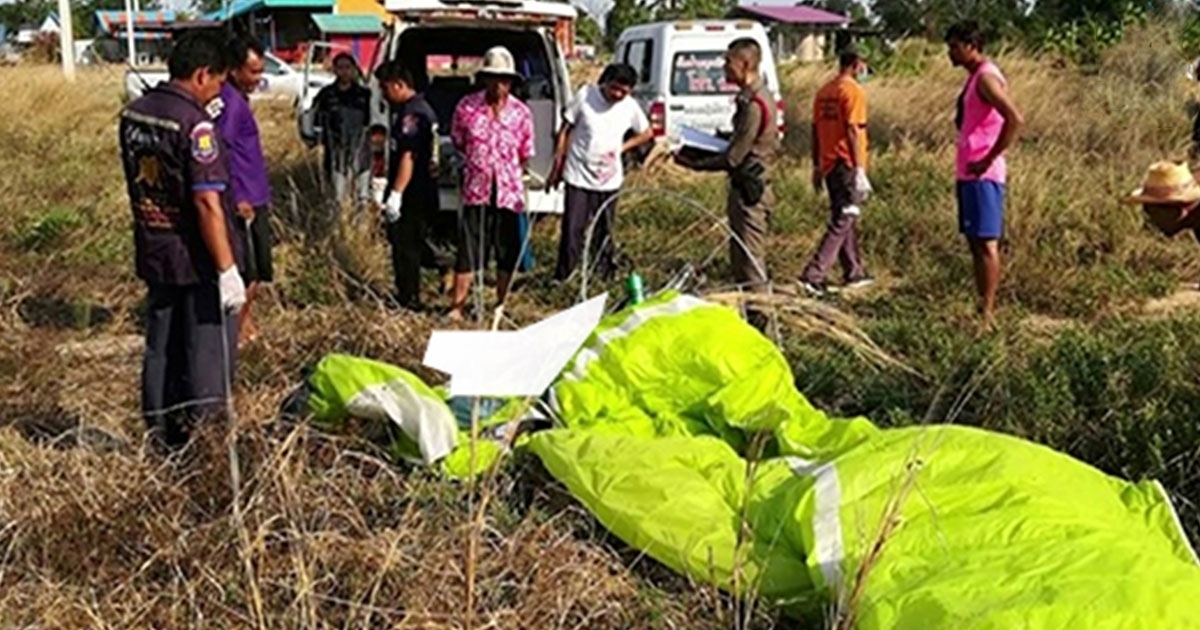 เครื่องร่อนพารามอเตอร์ ตกกลางทุ่งนาดับ 1 หลังเจอลมพัดแรงจนร่มหุบ ร่วงสู่พื้นเสียชีวิตทันที