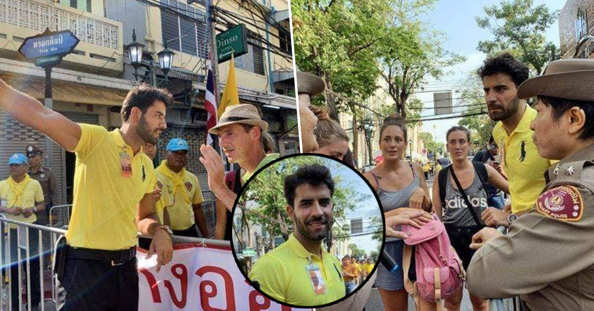 เรื่องราวดี ๆ หนุ่มชาวอิหร่าน สวมเสื้อสีเหลืองแสดงความจงรักภักดี อาสาเป็นล่ามช่วยแนะนำเส้นทางให้นักท่องเที่ยวต่างชาติที่ต้องการผ่านบริเวณพระราชพิธี