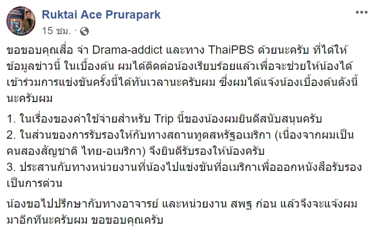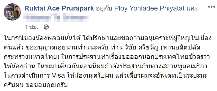 ขณะเดียวกัน มีรายงานเพิ่มเติมว่า นายรักไทย บูรพ์ภาค อาจารย์มหาวิทยาลัยศรีนครินทรวิโรฒ ได้มีการโพสต์เฟซบุ๊ก Ruktai Ace Prurapark ระบุว่า ขอเป็นอีกหนึ่งคนที่จะให้การช่วยเหลือน้องพลอย เนื่องจากตนเองเคยประสบปัญหาเช่นเดียวกัน โดยยินดีประสานสถานทูตสหรัฐอเมริกาเพื่อรับรองให้ รวมถึงยินดีช่วยเหลือในเรื่องของค่าใช้จ่ายในการเดินทางไปแข่งขันด้วย