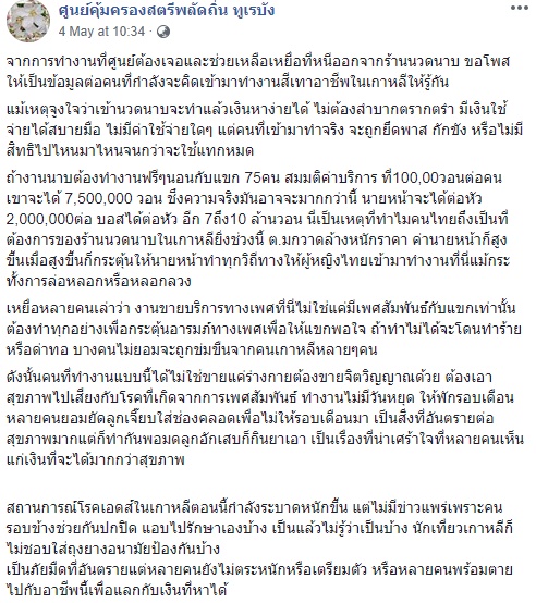 เมื่อวันที่ 7 พฤษภาคม 2562 เฟซบุ๊ก ศูนย์คุ้มครองสตรีพลัดถิ่น ทูเรบัง มีการเปิดเผยเรื่องราวของเหยื่อที่ทำงานนวดนาบในประเทศเกาหลีใต้
