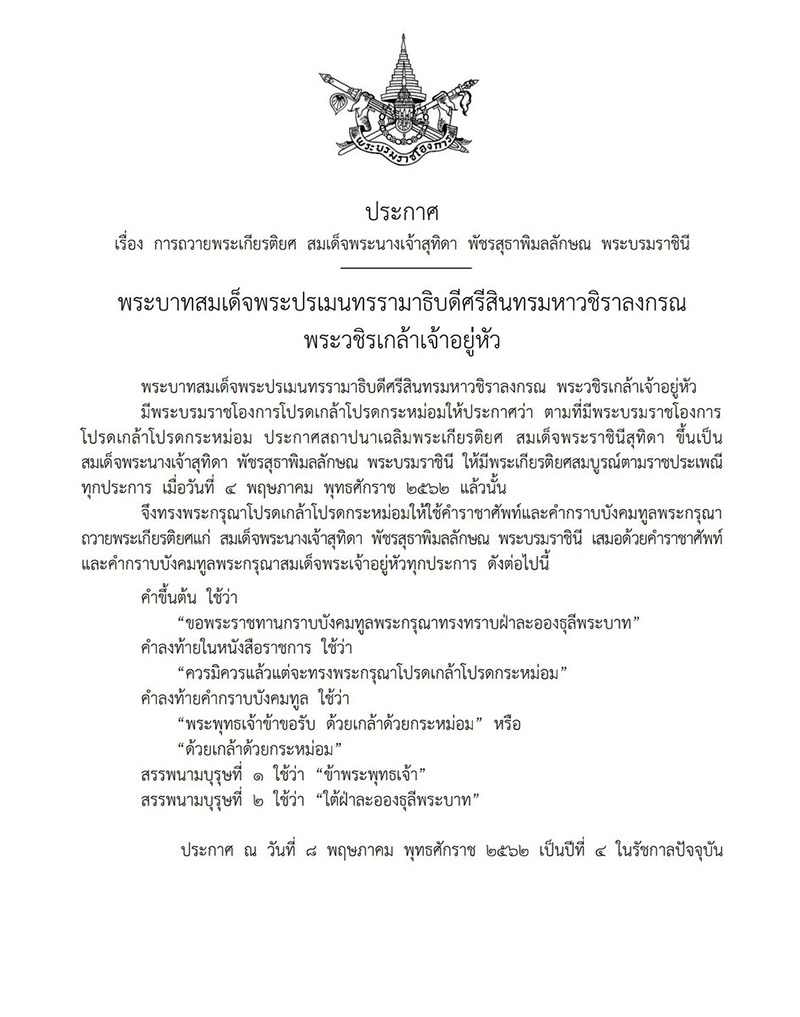 พระบาทสมเด็จพระปรเมนทรรามาธิบดีศรีสินทรมหาวชิราลงกรณ พระวชิรเกล้าเจ้าอยู่หัว มีพระบรมราชโองการโปรดเกล้าโปรดกระหม่อมให้ประกาศว่า ตามที่มีพระบรมราชโองการ โปรดเกล้าโปรดกระหม่อม ประกาศสถาปนาเฉลิมพระเกียรติยศ สมเด็จพระราชินีสุทิดา ขึ้นเป็นสมเด็จพระนางเจ้าสุทิดา พัชรสุธาพิมลลักษณ พระบรมราชินี ให้มีพระเกียรติยศสมบูรณ์ตามราชประเพณีทุกประการ เมื่อวันที่ 4 พฤษภาคม พุทธศักราช 2562 แล้วนั้น