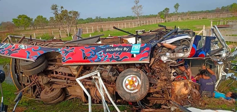 ก่อนชนอัดติดเข้ากับตอไม้ข้างถนน ทำให้มีผู้เสียชีวิต 1 คน และบาดเจ็บ 13 คน