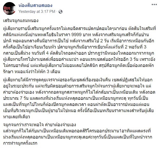 เป็นแผลคล้ายจมูกทะลุ ตนจึงกลับไปยังคลินิกเดิม ขอให้นำซิลิโคนออก