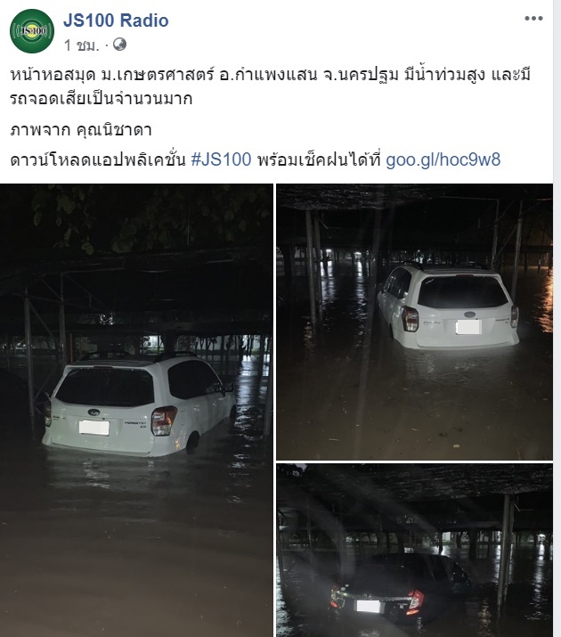 ทั้งนี้ มีภาพที่บริเวณหอสมุด มหาวิทยาลัยเกษตรศาสตร์ อ.กำแพงแสน จ.นครปฐม มีน้ำท่วมสูงเลยล้อรถยนต์ หลังฝนตกลงมาอย่างหนักเป็นเวลาหลายชั่วโมง ทำให้มีรถจอดเสียจำนวนมาก