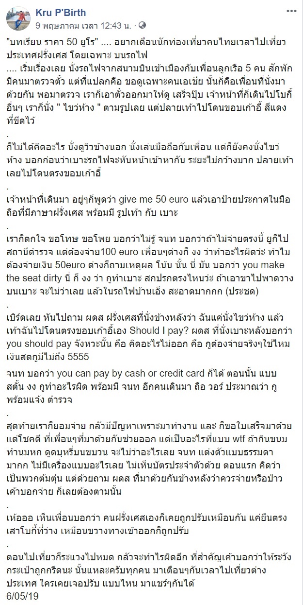 ขณะนี้ (13 พฤษภาคม 2562) โลกโซเชียลได้มีการแชร์เรื่องราวจากเฟซบุ๊ก Kru P'Birth ที่มีการโพสต์เตือนนักท่องเที่ยวคนไทยเวลาไปเที่ยวประเทศฝรั่งเศส โดยเฉพาะบนรถไฟ โดยระบุว่า "นั่งรถไฟจากสนามบินเข้าเมืองกับเพื่อนลูกเรือ