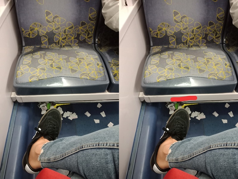 เราก็นั่ง "ไขว่ห้าง" ตามรูปเลย แต่ปลายเท้าไปโดนขอบเก้าอี้สีแดงที่ขีดไว้ ก็ไม่ได้คิดอะไร นั่งดูวิวข้างนอก นั่งเล่นมือถือกับเพื่อน แต่ก็ยังคงนั่งไขว่ห้าง บอกก่อนว่าเบาะรถไฟจะหันหน้าเข้าหากัน ระยะไม่กว้างมาก ปลายเท้าเลยไปโดนตรงขอบเก้าอี้ เจ้าหน้าที่เดินมาอยู่ ๆ ก็พูดว่า give me 50 euro แล้วเอาป้ายประกาศในมือถือที่มีภาษาฝรั่งเศส พร้อมมีรูปเท้ากับเบาะ เราก็ตกใจ ขอโทษขอโพย บอกว่าไม่รู้ เจ้าหน้าที่บอกว่าถ้าไม่จ่ายตรงนี้ ยูก็ไปสถานีตำรวจ แต่ต้องจ่าย 100 euro เพื่อน ๆ ต่างก็งง ว่าทำอะไรผิด ทำไมต้องจ่ายเงิน 50 euro ต่างก็ถามเหตุผล มันบอกว่า you make the seat dirty นี่ก็งงว่ากูทำเบาะสกปรกตรงไหนวะ ถ้าเอาขาไปพาดวางบนเบาะจะไม่ว่าเลย แล้วในรถไฟบ้านเอ็งสะอาดมากกก (ประชด)