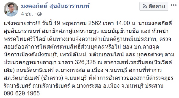 มงคลกิตติ์ หัวหน้าพรรคไทยศรีวิไลย์ เดินทางเข้าแจ้งความดำเนินคดี บก.ลายจุด-เพจมิติใหม่-สื่อดัง และบุคคลทั่วไป ฐานหมิ่นประมาท