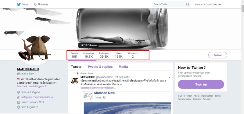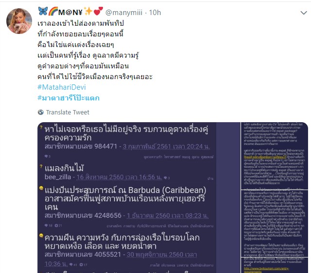 ทั้งนี้ แอคเคาท์ @MatahariDevi ถือเป็นแอคเคาท์คนดังบนโลกทวิตเตอร์ มีผู้ติดตามเกือบ 40,000 คน ซึ่งเธอเองมักจะแชร์ภาพชีวิตบนเกาะไซปรัส จากการไปทำงานเป็นสถาปนิกที่นั่น ซึ่งเธอมักจะใช้ชีวิตหรูหราฟู่ฟ่า พายุเฮอร์ริเคนเออร์ม่าเคยถล่มบ้านจนต้องย้ายบ้านไปเรื่อย ๆ รวมทั้งยังมีบ้านในหลายประเทศ ทั้งบ้านที่อังกฤษ ที่ให้คนอื่นเช่า ซื้อวิลล่าที่เกาะสมุยเพราะแพลนกลับมาเมืองไทยปีหน้า หรือเวลาไปพักผ่อนที่อิตาลี ฮังการี เธอก็ซื้ออุปกรณ์สกีใหม่หมด หรือกระทั่งเมาแล้วไปซื้อเรือมาขับเล่น ๆ