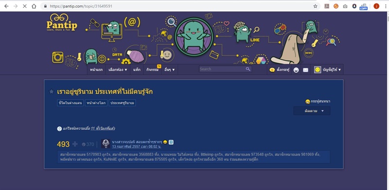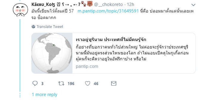 และบอกว่าเธอทำงานที่ประเทศซูรินาม และเป็นเจ้าของกระทู้ชื่อดังอย่าง "เราอยู่ซูรินาม ประเทศที่ไม่มีคนรู้จัก" ก่อนที่เธอจะลบข้อความทุกอย่างในกระทู้เมื่อช่วงค่ำที่ผ่านมา