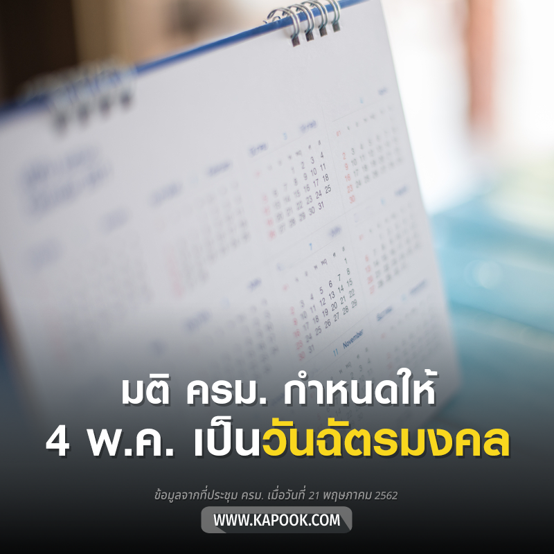 ครม. เห็นชอบให้วันที่ 4 พ.ค. เป็น วันฉัตรมงคล และวันหยุดประจำปี รวมถึงรับทราบ ภาพรวมวันหยุดตลอดทั้งปี รวม 19 วัน