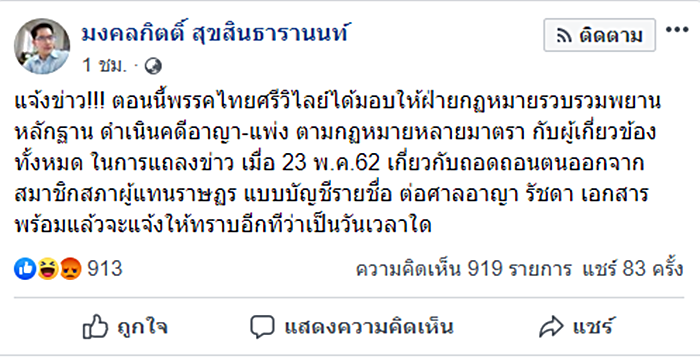 ขณะเดียวกัน ผู้สื่อข่าวรายงานว่า นายมงคลกิตติ์ ได้มีการโพสต์ข้อความผ่านเฟซบุ๊กส่วนตัว มงคลกิตติ์ สุขสินธารา ระบุว่า ทางพรรคไทยศรีวิไลย์ ได้มอบให้ฝ่ายกฎหมายรวบรวมพยานหลักฐาน ดำเนินคดีอาญา-แพ่ง ตามกฎหมายหลายมาตรา กับผู้เกี่ยวข้องทั้งหมด กรณีการแถลงข่าวในวันนี้ (23 พฤษภาคม 2562) เกี่ยวกับถอดถอนตนเองออกจากสมาชิกสภาผู้แทนราษฎรแบบบัญชีรายชื่อ ต่อศาลอาญา รัชดาภิเษก เอกสารพร้อม โดยจะมีการแจ้งรายละเอียดเกี่ยวกับวันและเวลาอีกครั้ง