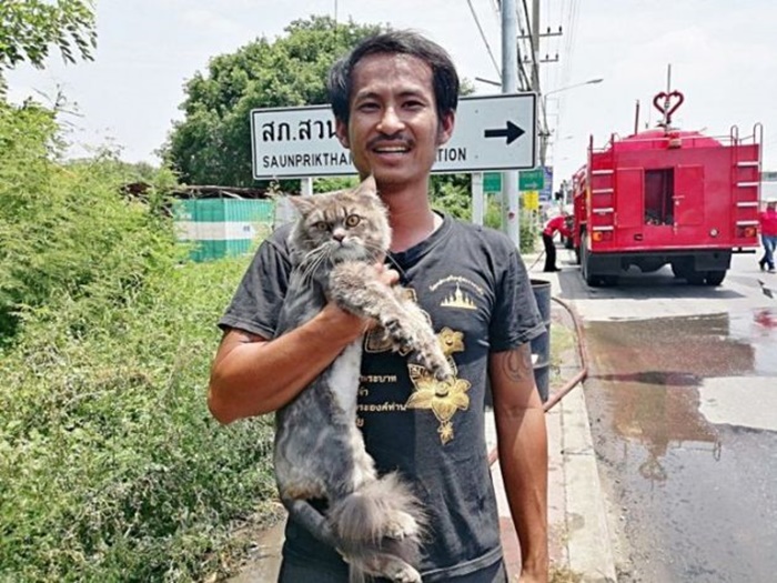 จากนั้นอยู่ ๆ ก็เกิดเปลวเพลิงลุกขึ้น นายสัญญาจึงรีบคว้าเหมียวคู่ใจ