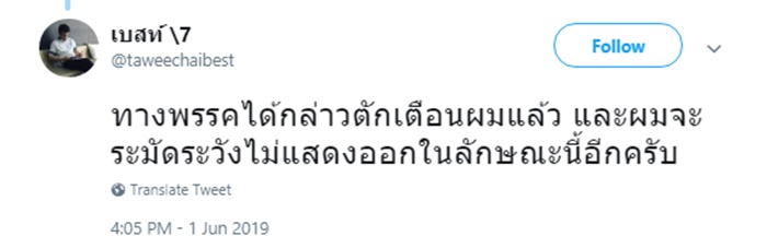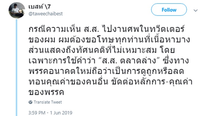 ตนต้องขอโทษที่โพสต์ดังกล่าวมีการแสดงทัศนคติที่ไม่เหมาะสม