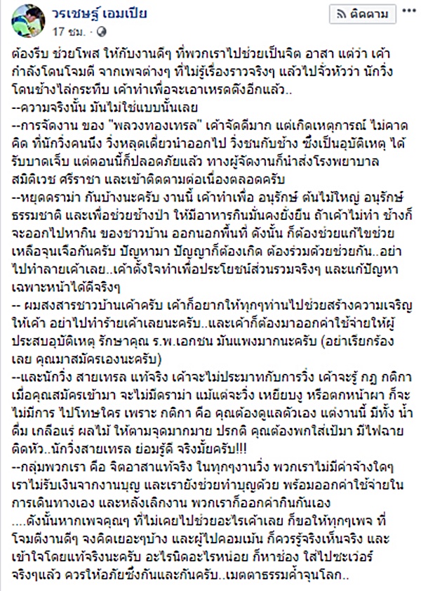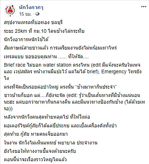 ทั้งนี้ ทางเพจทราบมาว่าการเตรียมงานยังไม่พร้อมเท่าไร ไม่ได้มีการบรีฟเรื่องการวิ่งตลอดจนจุดที่ให้น้ำ นอกจากนี้จุดที่จัดงานยังเป็นรอยต่อป่าใหญ่ ที่มีช้างเข้ามาหากินเป็นประจำ ชาวบ้านก็เตือนทางผู้จัดงานแล้ว แต่ยังมีการจัดงานต่อ