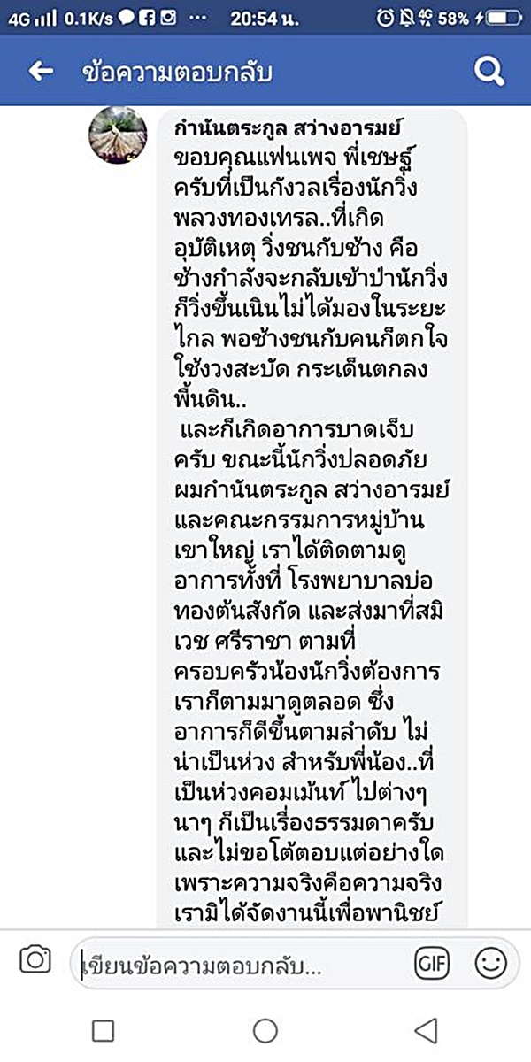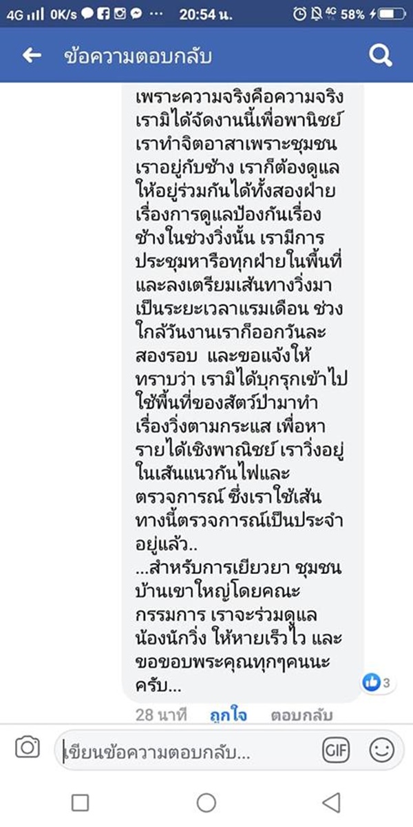 พร้อมกันนี้ยังได้เผยถึงคำชี้แจงเพิ่มเติมจากประธานจัดงานด้วยว่า งานวิ่งดังกล่าวมีการจัดเตรียมงานมาเป็นเวลาแรมเดือน และมีการออกสำรวจพื้นที่ล่วงหน้าแล้ว ยืนยันว่าเส้นทางการวิ่งไม่ได้บุกรุกพื้นที่หากินของช้าง แต่อยู่ในเส้นแนวกันไฟ ที่ชาวบ้านใช้ตรวจการณ์เป็นประจำ อย่างไรก็ตามทางชุมชนจะร่วมดูแลเยียวยานักวิ่งที่บาดเจ็บต่อไป