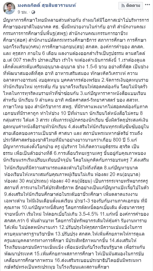 ได้โพสต์ข้อความผ่านทางเฟซบุ๊กระบุว่า ปัญหาการศึกษาไทยมีหลายส่วนด้วยกัน