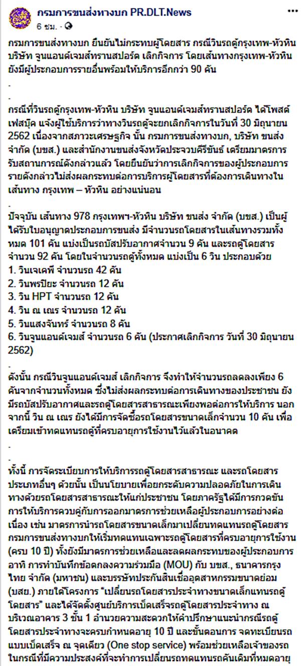 เกี่ยวกับเรื่องนี้ วันที่ 14 มิถุนายน 2562 กรมการขนส่งทางบก PR.DLT.News ออกมาชี้แจงว่า กรณีการปิดกิจการของ วินรถตู้กรุงเทพ-หัวหิน บริษัท จูนแอนด์เจมส์ทรานสปอร์ต ทางกรมขนส่งฯ และหน่วยงานที่เกี่ยวข้องได้เตรียมมาตรการรับสถานการณ์ดังกล่าวแล้ว ยืนยันว่าไม่ส่งผลกระทบต่อการบริการผู้โดยสารที่ต้องการเดินทางในเส้นทาง กรุงเทพ ? หัวหิน อย่างแน่นอน