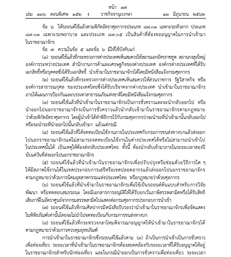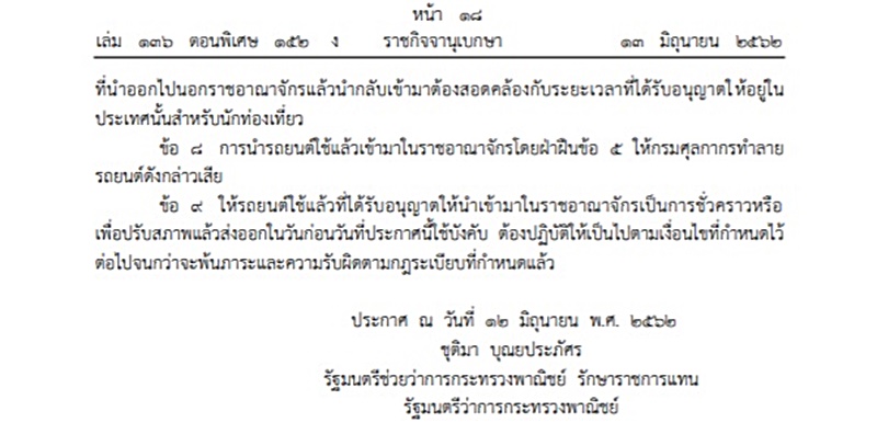ราชกิจจานุเบกษา เผยแพร่ประกาศกระทรวงพาณิชย์ ให้รถยนต์ใช้แล้วเป็นสินค้าต้องห้าม หรือต้องขออนุญาต ก่อนนำเข้าราชอาณาจักร หากฝ่าฝืนให้กรมศุลกากรทำลายเสีย