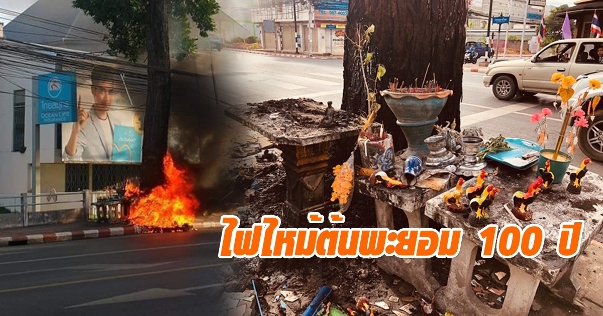 ไฟไหม้ต้นพะยอม อายุ 100 ปี ริมถนนเทศบาลนครสุราษฎร์ธานี โคนต้นดำไหม้ ของแก้บนวอดเกือบหมด คาดเพราะมีคนจุดธูปเทียนทิ้งไว
