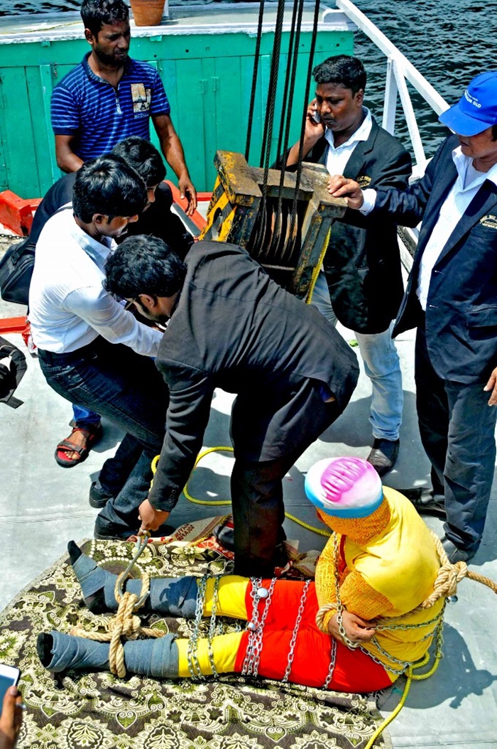 ด้วยการใช้โซ่กับเชือกมัดตัวเอง ก่อนหย่อนลงไปในแม่น้ำคงคาแล้ว