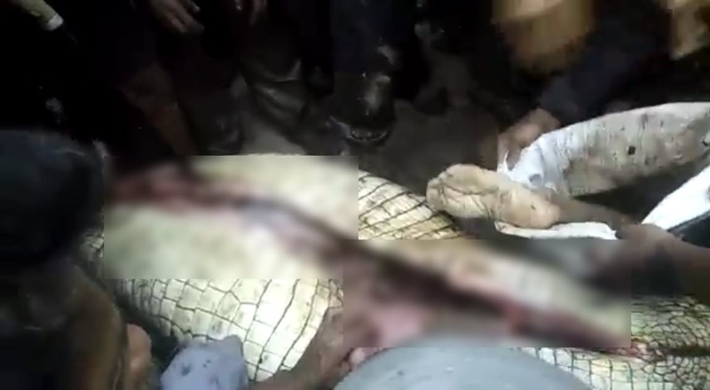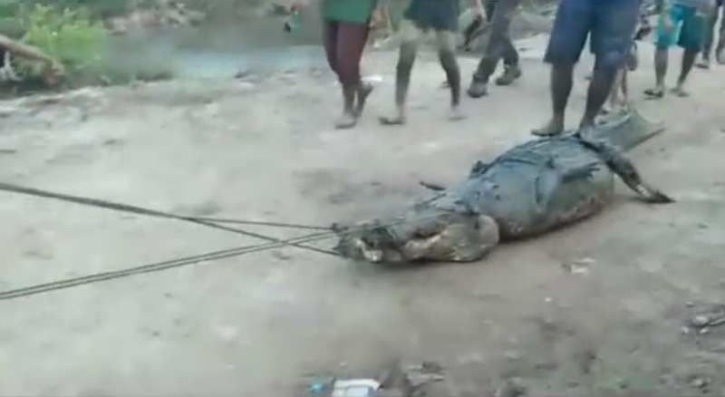 คลิปวิดีโอบนสังคมออนไลน์เผยให้เห็นซากจระเข้ขนาดใหญ่ถูกจับมัดแล้วลากขึ้นมาบนบก