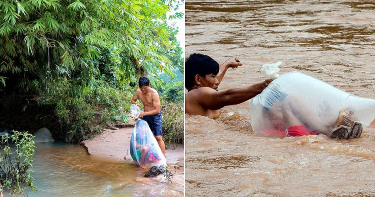 เด็ก ๆ ในหมู่บ้านประเทศเวียดนามแสนลำบาก ต้องถูกนำใส่ถุงพลาสติก พาข้ามแม่น้ำไหลเชี่ยว เพื่อไปโรงเรียนที่อยู่อีกฝั่ง แถมต้องเดินเท้าต่อไปอีกไกลถึง 15 กิโลเมตร