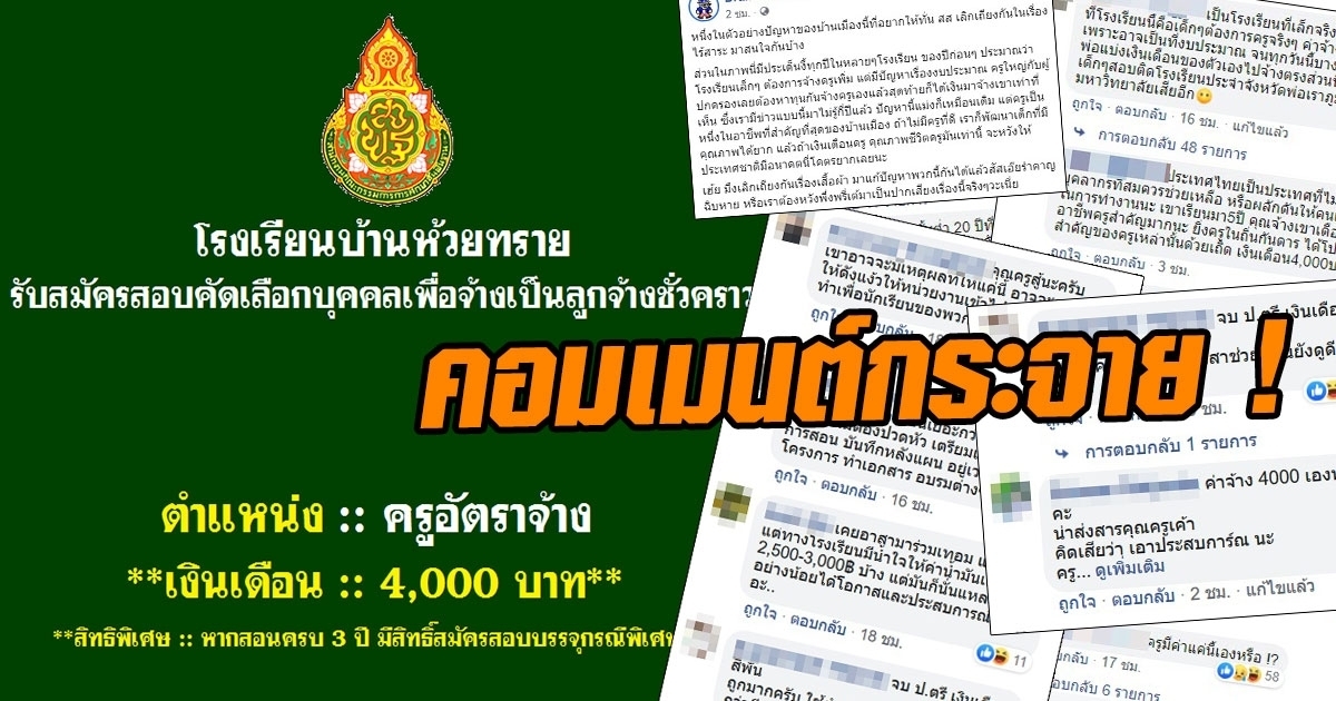กลายเป็นภาพที่ถูกแชร์จำนวนมากในโลกออนไลน์ กรณีเพจเฟซบุ๊ก สมัครงาน สอบราชการ ได้ประกาศว่า โรงเรียนบ้านห้วยทราย รับสมัครสอบคัดเลือกบุคคลเพื่อจ้างเป็นลูกจ้างชั่วคราว ตำแหน่งครูอัตราจ้าง โดยระบุว่า เงินเดือน 4,000 บาท โดยรับสมัคร วันที่ 3 - 9 กรกฎาคม 2562 แต่หากทำงานครบ 3 ปี สามารถสอบบรรจุกรณีพิเศษ