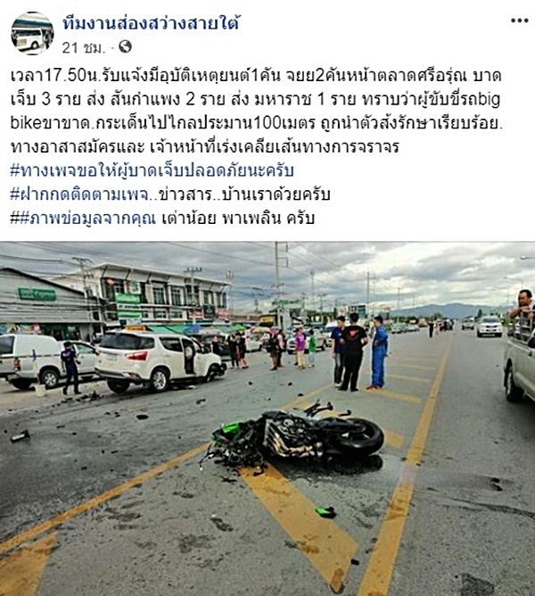 เมื่อวันที่ 6 กรกฎาคม 2562 เฟซบุ๊ก ทีมงานส่องสว่างสายใต้ แจ้งข้อมูลอุบัติเหตุ ระบุว่า มีรถชนกันบริเวณหน้าตลาดศรีอรุณพลาซ่า